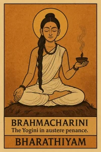 Brahmacharini (Day 2): Brahmacharini, the second form of Navadurga, embodies deep devotion, penance, and inner discipline. She is depicted walking barefoot, holding a rosary (japamala) in one hand and a water pot (kamandalu) in the other. Symbolizing perseverance and austerity, she recalls Goddess Parvati’s intense tapasya to attain Lord Shiva. Worshipping Brahmacharini blesses devotees with clarity, patience, and spiritual strength, helping them overcome difficulties through steadfast faith and self-control.