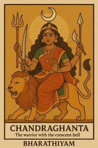 Chandraghanta (Day 3): Chandraghanta, the third form of Navadurga, is revered as the goddess of bravery and serenity. She adorns a crescent moon (chandra) shaped like a bell (ghanta) on her forehead, symbolizing divine sound that dispels negativity. Riding a tiger or lion, she carries weapons in ten hands, ready to battle evil, yet radiates compassion to her devotees. Worship of Chandraghanta grants courage, fearlessness, and harmony, protecting devotees from obstacles and inner turmoil.
