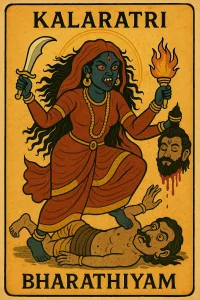 Kalaratri (Day 7): Kalaratri, the seventh form of Navadurga, is the fiercest and most protective aspect of the Goddess. Dark in complexion, with disheveled hair, three eyes glowing like lightning, and a necklace of thunder, she rides a donkey and carries a sword and iron hook. Despite her fearsome form, she is known as Shubhankari—the bringer of auspiciousness—destroying demons, fears, and ignorance. Worshipping Kalaratri grants fearlessness, inner strength, and swift removal of obstacles.