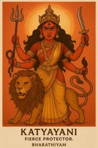 Katyayani (Day 6): Katyayani, the sixth form of Navadurga, is the fierce warrior goddess born to sage Katyayana after his penance. She rides a lion and wields a sword, trident, and lotus, radiating power and righteousness. It was in this form that the Devi destroyed Mahishasura, symbolizing the victory of dharma over adharma. Worship of Katyayani grants courage, willpower, and protection from negativity. She is also invoked by young devotees seeking an ideal life partner.