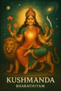 Kushmanda (Day 4): Kushmanda, the fourth form of Navadurga, is celebrated as the cosmic creatrix who brought light into the dark void. Her name means “the one who created the universe with her smile.” She rides a lion and is depicted with eight or ten hands holding weapons, rosary, and a nectar-filled pot. She radiates boundless energy, nourishing creation itself. Worshipping Kushmanda blesses devotees with vitality, creativity, and prosperity, while dispelling sorrow and disease.