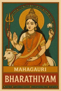 Mahagauri (Day 8): Mahagauri, the eighth form of Navadurga, embodies purity, serenity, and compassion. Her name means “extremely fair” or radiant, symbolizing the brilliance of inner stillness and cleansing grace. Depicted riding a bull and carrying a trident and drum, she is the youthful, gentle form of Parvati who attained great penance to unite with Shiva. Worship of Mahagauri removes past karmic impurities, bestows peace, harmony, and grants devotees spiritual progress along with domestic happiness.