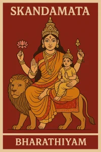 Skandamata (Day 5): Skandamata, the fifth form of Navadurga, is worshipped as the compassionate mother of Lord Skanda (Kartikeya). She is depicted seated on a lotus, carrying her divine son on her lap, and riding a lion. With four arms, she holds lotuses and grants blessings of peace and prosperity. Skandamata represents selfless motherly love, protection, and devotion. Worshipping her bestows wisdom, harmony in family life, and liberation through the grace of the Divine Mother.