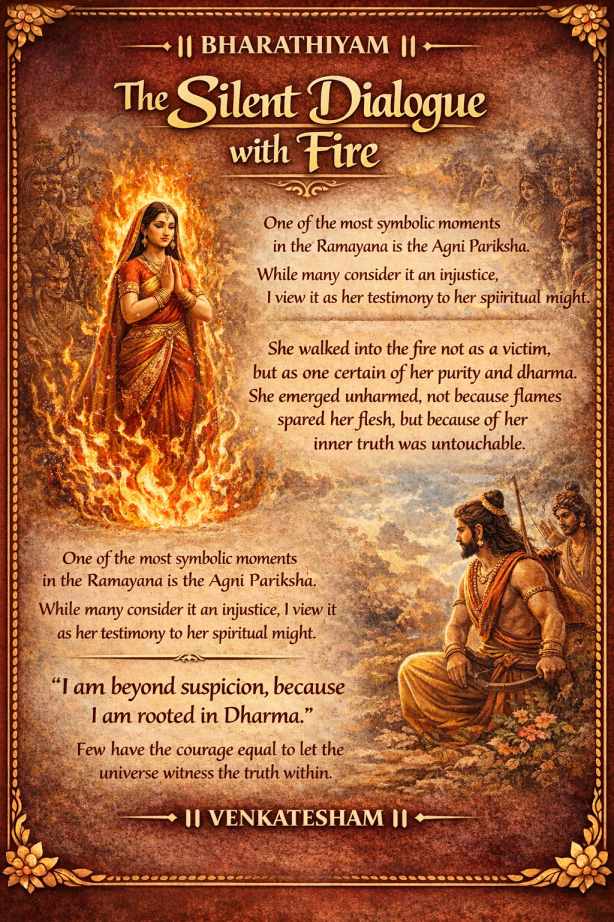 The trial by fire became her final word, not to Rama alone, but to the entire world: “I am beyond suspicion, because I am rooted in dharmaTransliteration: धर्म / Dharma Meaning / Explanation: That which upholds, sustains, and maintains cosmic and social order. Includes duty, righteousness, natural law, and inner truth. Origin: Sanskrit (from root dhṛ — “to hold, support”) Note: Dharma is contextual — it changes with role, time, and stage of life. More.” Few forms of courage equal the power to let the universe itself bear witness to one’s truth.